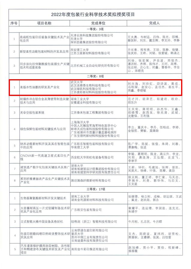 熱烈祝賀我司“柔版水性油墨的研發(fā)及產(chǎn)業(yè)化”項(xiàng)目被中國包裝聯(lián)合會(huì)、中國包裝有限責(zé)任公司評(píng)定為“2022年度包裝行業(yè)科學(xué)技術(shù)獎(jiǎng)”二等獎(jiǎng)